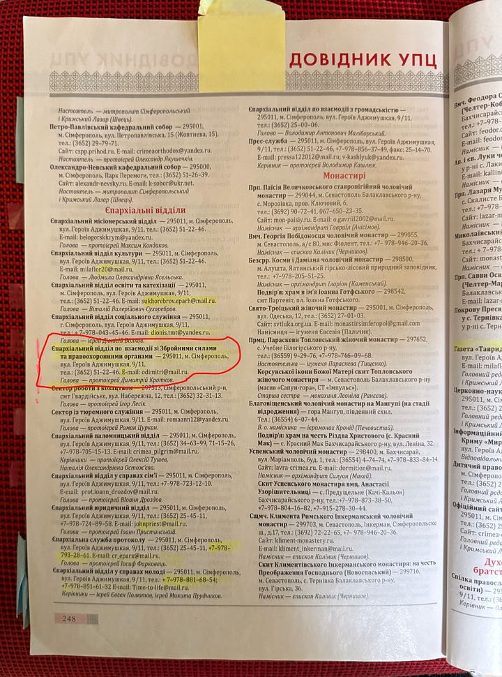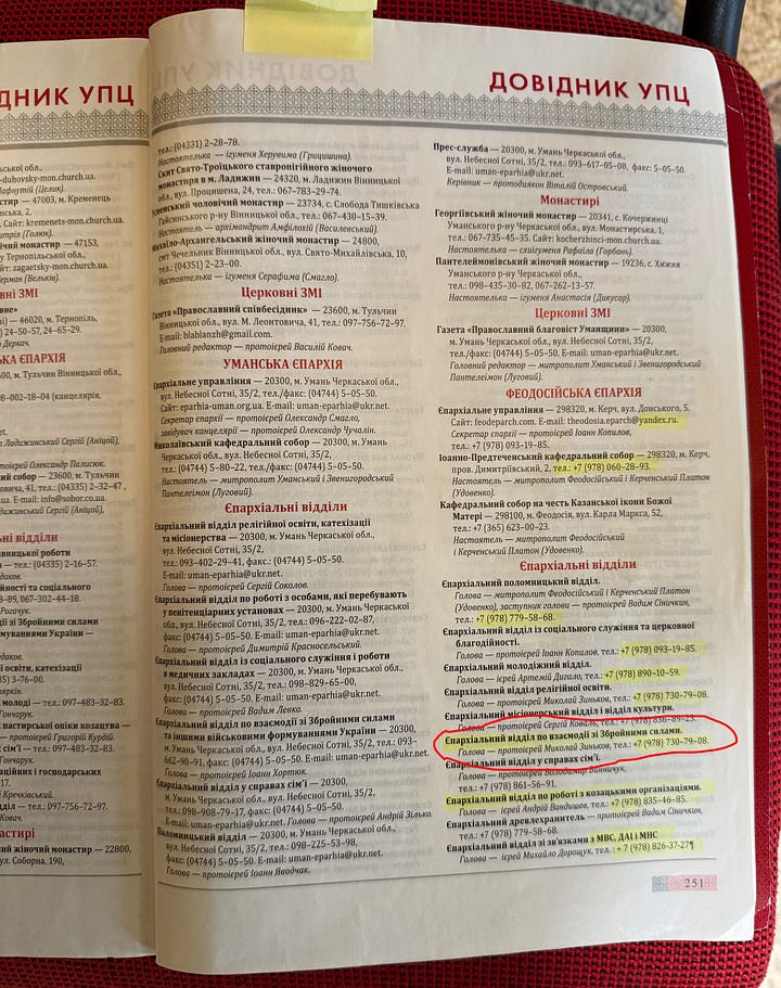UOC-MP collaboration with the Russian military has just not one, but two official channels, according to the phone directory. The red circled entry on the bottom left photo indicates you can contact “Diocesan Office for Relations with the Armed Forces and Law Enforcement” by emailing a .ru Russian email address that is banned in Ukraine. The address for the office is in Russian occupied Crimea. The bottom right red circled entry shows you can contact Mykolai Zyn’kov at the “Diocesan Department for Cooperation with the Armed Forces” at his +7 telephone number. +7 is the country code for Russia.