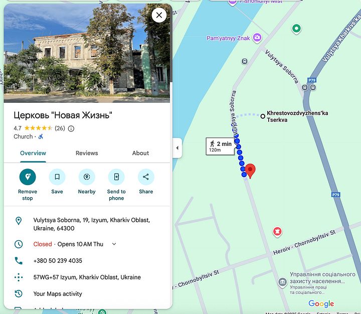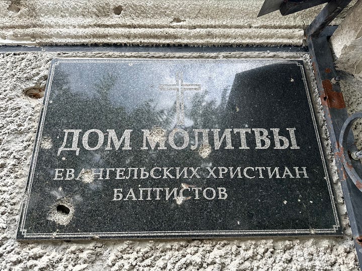 Google Maps shows that the New Life Baptist Church, (the bullet-riddled sign says House of Prayer Evangelical Christian Baptists) is a two-minute walk from the Exaltation of the Cross Church, a church of the UOC-MP.