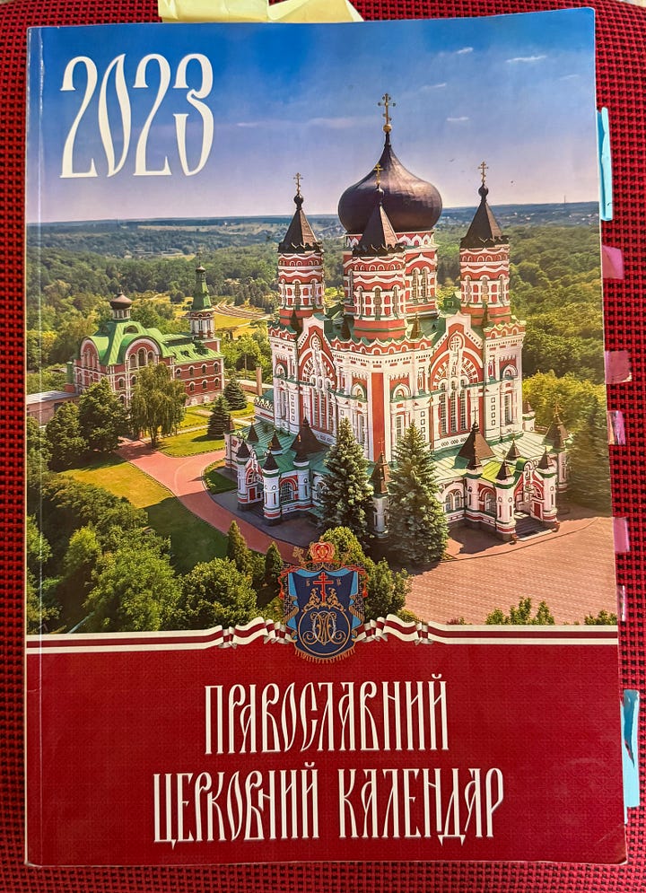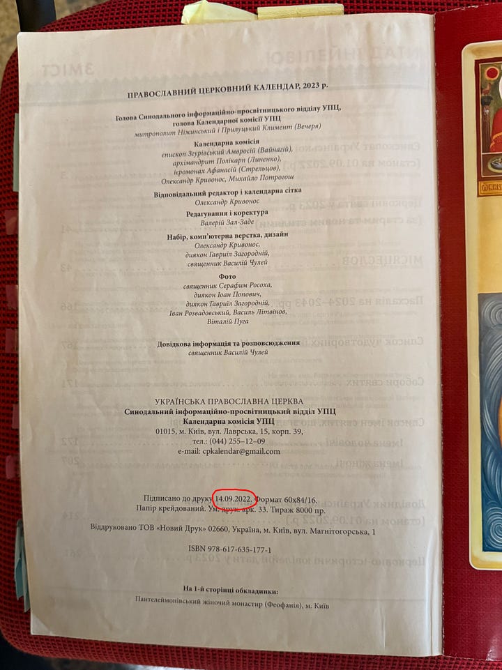 The UOC-MP collaboration with Russia is well-organized. The Orthodox church gave birth to the word “byzantine,” now used to describe a system involving a great deal of administrative detail. The 2023 annual calendar for the Ukrainian Orthodox Church exemplifies this. Printed on September 9, 2022, a little more than three months after the UOC-MP Facebook post declaring independence, dozens of entries in the phone directory have Russian numbers and email addresses.